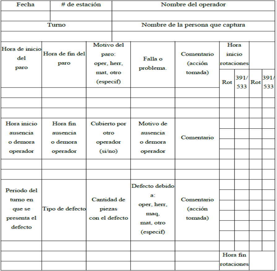 Para la capacidad de entrega se recopiló información de las piezas entregadas y de las piezas planeadas a entregar a los clientes. Para obtener el índice de eficiencia, se recopiló información de las piezas fabricadas, tiempo estándar por estación de trabajo y tiempo total de fabricación. Con respecto al índice de calidad, la información recopilada fueron tanto las piezas realizadas como de las piezas defectuosas. En relación con el índice de disponibilidad, fue recopilada información de los tiempos de paros causados por determinadas fallas y los tiempos de funcionamiento. Esta información fue complementada con información obtenida del área de manufactura, del área de producción, del área de calidad y del área de mantenimiento. Otra información recopilada fueron las piezas entregadas por hora a los clientes, las piezas planeadas o acordadas a entregar por hora a los clientes, tiempo estándar por estación de trabajo y piezas defectuosas por hora.