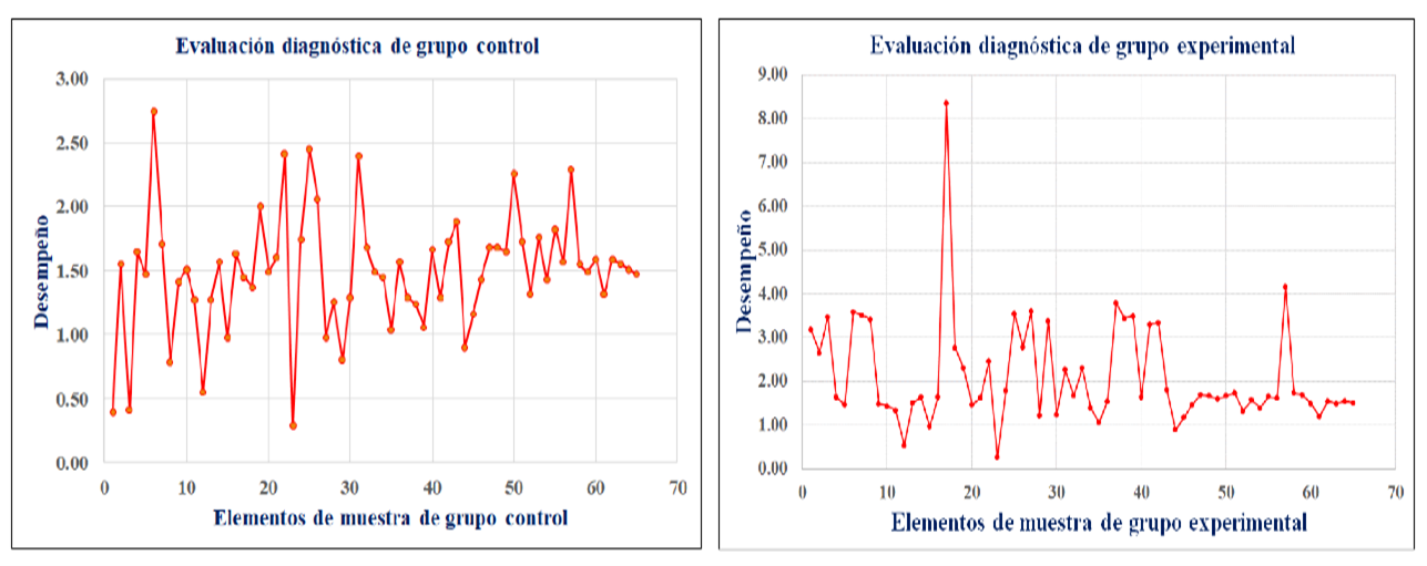 En la Figura 5 se muestran los resultados detallados de la evaluación diagnóstica del grupo control y experimental, respectivamente, cada uno de 65 elementos.