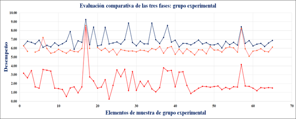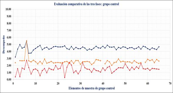 Figura 8 Comparativo de evaluación de desempeño de las tres etapas de evaluación: grupo control. Rojo: etapa de diagnóstico, azul: etapa de intervención, naranja: etapa a cuatro meses de la intervención