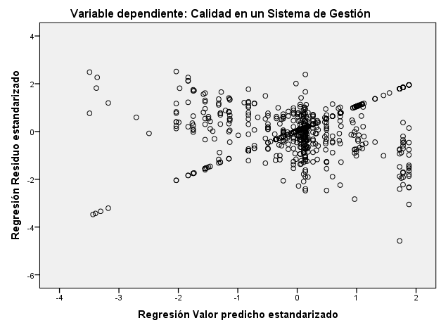 El supuesto de homocedasticidad se verifica y acepta, ya que observamos (en la Figura 5) una óptima distribución de los datos, además de la ausencia de aglomeraciones en donde la mayoría de los datos de agrupen.