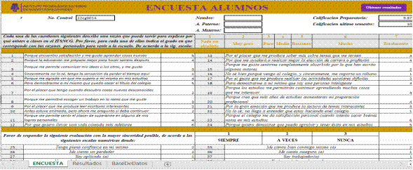 Para la elaboración de la plantilla automatizada, como primer paso se utilizó Excel con macros para programar las funciones y fórmulas, y de esta manera obtener la valoración de cada factor psicológico a medir con la dimensión correspondiente. Se diseñaron tres hojas de cálculo: la primera se llama "Encuesta", contiene el total de las preguntas con las opciones de respuesta. Los campos a llenar son el número de control del estudiante, el nombre con los apellidos y la calificación del primero y segundo semestre (en caso de que se encuesten alumnos de otros semestres). Está programado para que, en caso de que falte alguna pregunta por contestar por error, se active un mensaje y no permita avanzar hasta que se respondan todos los ítems. Ver figura 1.