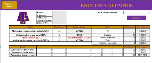 Con la información recolectada, se elaboró un reporte para el área de tutorías y psicología con la valoración individual de cada uno de los alumnos, los puntajes obtenidos y la interpretación del nivel de cada factor. Esto permitirá que estos departamentos analicen, desarrollen e implementen estrategias de fortalecimiento en esos factores psicológicos para un sano desarrollo humano que les brinde herramientas para enfrentar situaciones complicadas durante su formación profesional. Ver figura 4.