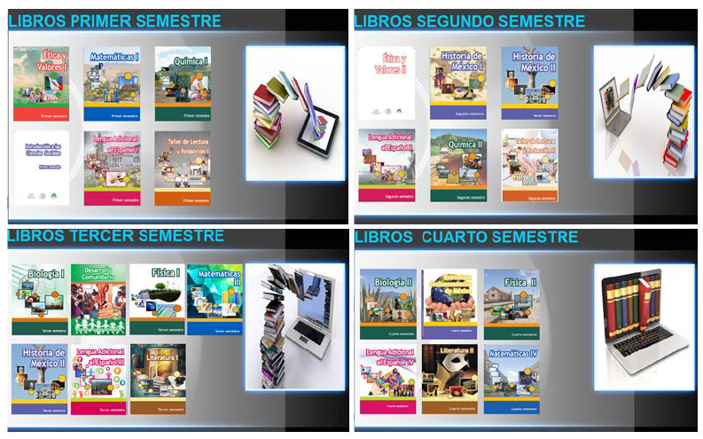 En la figura anterior se puede observar que dentro de la ventana principal aparece la presentación y las opciones de consulta de diversos libros digitales en la biblioteca, los cuales fueron cargados de manera predeterminada para su consulta y descarga en formato PDF. En la aplicación se hallan disponibles libros para estudiantes que cursan del primero al sexto semestre (figura 4).