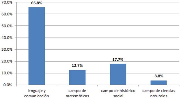 Asimismo, se preguntó a los estudiantes cuántas horas dedicaban a la aplicación Biblioteca Digital. Los resultados muestran que el 3.8 % le dedica menos de una hora, el 31.6 % entre una y dos horas, el 38 % de tres a cinco horas, el 16.5 % de cinco a 8 horas, y solo el 10.1 % no sabe cuántas horas le dedica a la plataforma. Además, se preguntó qué campo de conocimiento consulta: el 65.8 % consulta obras sobre lenguaje y comunicación, el 12.7 % sobre matemáticas, el 17.7 % sobre el campo de histórico y social, y el 3.8 % sobre ciencias naturales (figura 5).