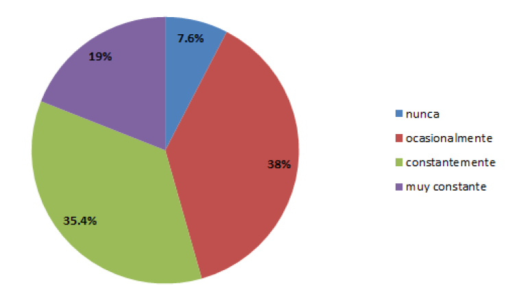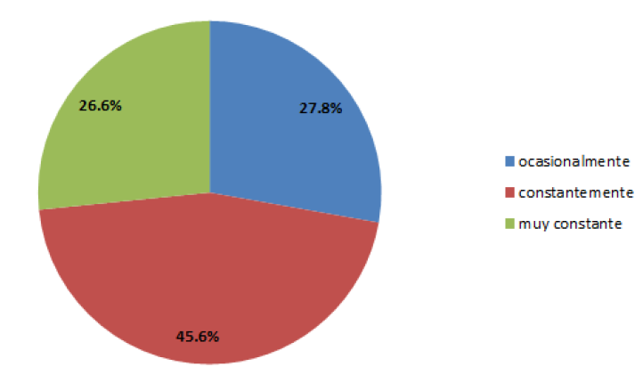 En cuanto a la frecuencia de uso de la aplicación, los resultados fueron los siguientes: el 27.8 % ocasionalmente, el 45.6 % constantemente y el 26.6% muy constante (figura 6).