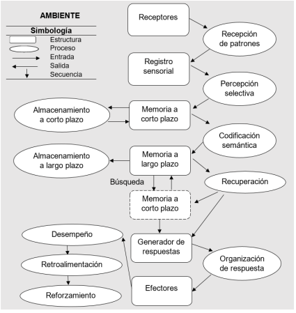 Gagné (1987) propone un modelo de procesamiento de información para explicar cómo se lleva a cabo el aprendizaje, el cual consta de varias etapas y procesos. Como se muestra en la figura 1, la información se recibe a través de los sentidos y se procesa en el registro sensorial. Si la información es relevante, se convierte en información nerviosa y se almacena en la memoria a corto plazo (MCP). La capacidad de esta memoria es limitada y puede almacenar información de forma acústica o articulada. Luego, la información se codifica semánticamente y se almacena en la memoria a largo plazo (MLP) de forma permanente, aunque puede ser difícil de acceder debido a la interferencia o al olvido. Para recuperar la información almacenada en la MLP se requieren pistas o índices que facilitan el proceso de búsqueda y recuperación. El material recuperado puede ser procesado nuevamente en la MCP o utilizarse directamente en la generación de respuestas o habilidades automatizadas. El recuerdo de la información previamente aprendida puede manifestarse poco tiempo después del aprendizaje o en momentos posteriores.