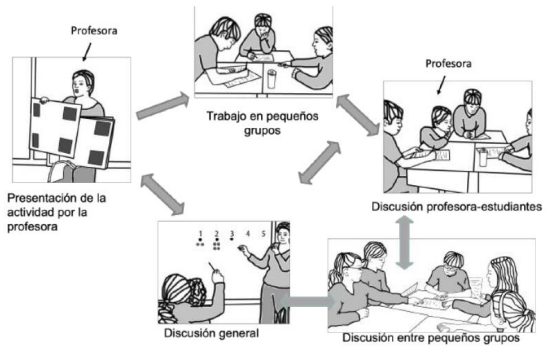 El profesor presenta la actividad y los estudiantes trabajan en pequeños grupos mientras el profesor visita esos grupos y realiza preguntas o comentarios.