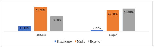 En las figuras 1, 2 y 3 se aprecia la clasificación de los niveles: principiante, medio y experto, y se observa la ponderación de la puntuación otorgada por los docentes a los 25 ítems de la tabla 1.