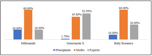 Por otro lado, Pinto et al. (2022) encontraron que los docentes más jóvenes poseen un conjunto más amplio de competencias digitales, lo que implica un mayor conocimiento, habilidades superiores y actitudes más favorables en comparación con los docentes de mayor edad. En nuestro caso, hemos observado diferencias, pero basadas en la generación. Los docentes de la generación X exhiben un mayor grado de competencia en el uso de las TIC en comparación con los millennials y los baby boomers. En este aspecto, compartimos la conclusión de Blanc Pihauve y León Rodríguez (2018) sobre la existencia de brechas digitales generacionales entre los docentes de la generación X y las generaciones de millennials y baby boomers. Esto pone de manifiesto diferencias en el grado de utilización de las TIC, lo que sugiere la existencia de una brecha digital generacional importante, especialmente para conectar con los estudiantes que emplean frecuentemente la tecnología.