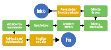 En relación con los respaldos proporcionados por la Incubadora de Negocios Universitaria (ICEU), se destacan los siguientes: Programa de Desarrollo del Modelo de Negocio, Resumen Ejecutivo, Proyección Financiera y Plan de Puesta en Marcha. Asimismo, se ofrecen capacitaciones empresariales que incluyen temáticas como mercadotecnia, fiscalidad, aspectos legales, innovación y creatividad, administración, entre otras. Además, se brinda asesoría y facilita la vinculación a opciones de financiamiento, ya sea por parte del gobierno federal, estatal, o a través de instituciones bancarias y financieras. En la figura 1 se observa el proceso de incubación.