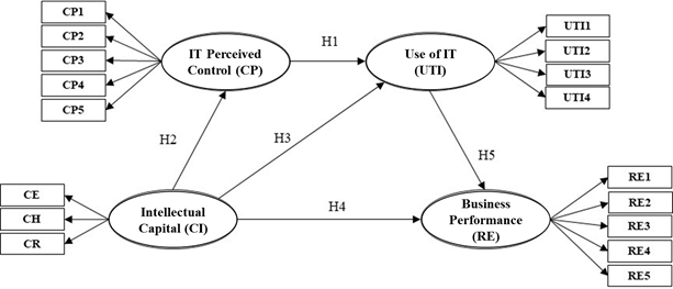 Fernández-Portillo et al. (2020) consider that IT usage is an essential factor in increasing sales, suggesting that companies should integrate IT as a primary part of their structure. Other research studies by Awamleh & Ertugan (2021), Kucharska & Erickson (2019), Jiang et al. (2018), Singh et al. (2017), and Bourdeau et al. (2021) indicate that IT usage is crucial for the growth and development of competitive advantage in businesses. Therefore, increased IT usage can serve as a valid conduit to generate sustainable competitive advantage. Based on these considerations, it is evident that IT usage is a relevant element that can lead to an increase in SMEs' performance. Consequently, the following hypothesis is formulated, and the graphical representation of the research model is shown in Figure 1. It should be noted that the proposed model may suggest the existence of some mediating or moderating effects between variables; however, the present research does not analyze these relationships.