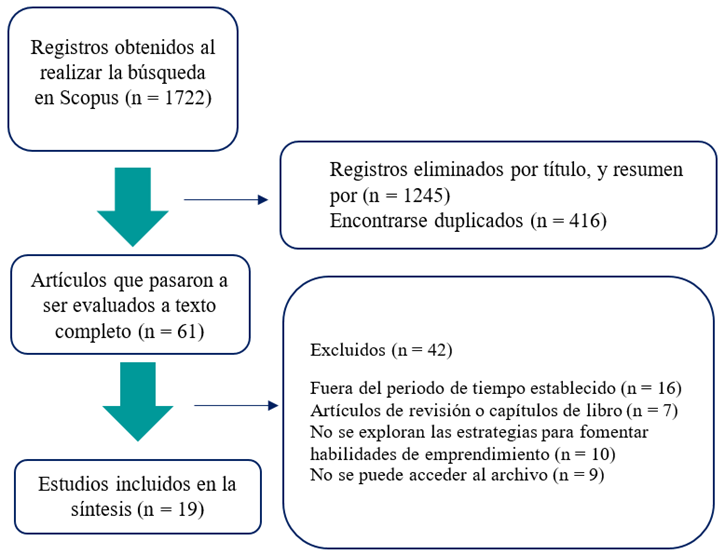 Durante la búsqueda en Scopus, se identificaron un total de 1722 artículos; posteriormente, se leyeron los títulos, resúmenes y textos completos de estos documentos. Se observó que 1245 de ellos no estaban alineados con el objetivo y la temática del presente estudio. De igual manera, se eliminaron 416 artículos por ser duplicados. Como resultado de este proceso, se obtuvo un total de 61 artículos para revisión completa, de los cuales 42 no cumplían con los criterios de inclusión establecidos en el estudio debido a las siguientes razones: 16 fueron excluidos por haber sido publicados fuera del periodo 2015-2023; 7 por ser artículos de revisión o capítulos de libro; 10 por no incluir las estrategias utilizadas para desarrollar las habilidades de emprendimiento en los estudiantes de secundaria y educación superior y, finalmente, 9 debido a la falta de acceso al documento completo.