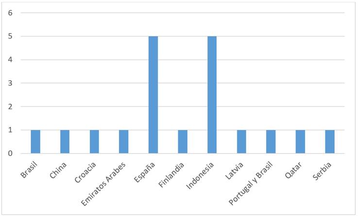 Al evaluar el lugar de origen de los estudios (figura 2), se observa que 10 de los 19 estudios se llevaron a cabo en España e Indonesia, mientras que en cada uno de los demás países solo se identificó un estudio.