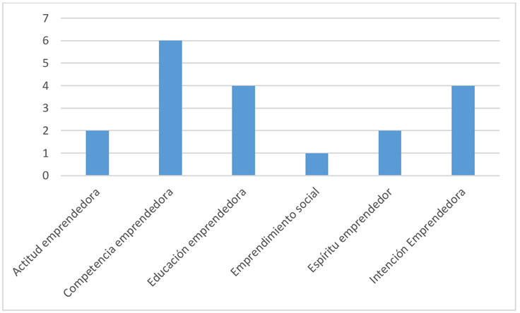 En la figura 5 se pueden observar las habilidades, conocimientos y actitudes asociadas a la competencia emprendedora que fueron evaluadas en los estudios revisados. En este sentido, se encontró que la competencia emprendedora fue la principal variable evaluada en el 31.6 % de los estudios, seguida de la educación e intención emprendedora, cada una con un 21.1 %. Finalmente, el emprendimiento social representó el 5.3 % de los casos.