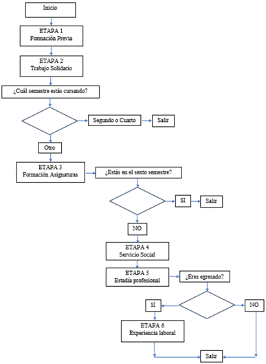 | Etapa 1 Formación previa | Etapa 2 Trabajo solidario | Etapa 3 Formación asignaturas | Etapa 4 Servicio social | Etapa 5 Estadía profesional | Etapa 6 Experiencia laboral | |