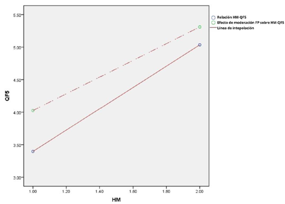 Los coeficientes de determinación (coeff), por otra parte, son una herramienta importante para validar el análisis de regresión. En la tabla 4 se puede observar que la variable independiente (HM) tiene un efecto estadísticamente significativo (p = 0.000) en la variable dependiente (AF), mientras que la variable moderadora (FP) ejerce un impacto estadísticamente significativo (p = 0.002) en la variable dependiente (AF). Además, el coeficiente "Int_1", que representa la interacción entre la variable independiente y moderadora (HM*FP) sobre la variable dependiente (AF), también muestra un resultado estadísticamente significativo (p = 0.050). La presencia de valores representativos en estas interacciones indica la existencia de un efecto de moderación, lo que sugiere que la evaluación del fenómeno es confiable.