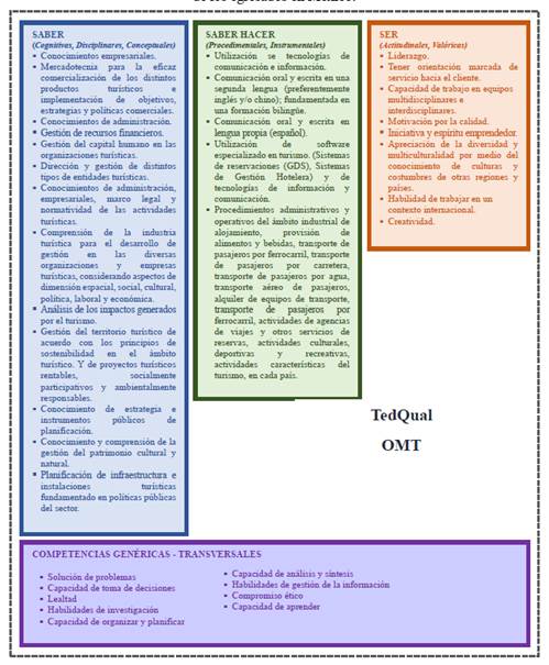 Finalmente, es importante exponer que la Secretaria de Turismo de México (2014) ha creado la Guía de Instituciones de Enseñanza Turística, con el fin de informar la oferta educativa de cada institución e incluye a las instituciones que imparten estudios relacionados con la actividad turística en cuatro diferentes niveles educativos: Básico o Formación para el Trabajo, Nivel Medio Superior, Nivel Superior y Diplomados. En México la educación turística está estructurada en cuatro niveles formativos y en la mayoría de los casos las instituciones y/o programas de estudio muestran tipologías de vinculación elemental con organizaciones públicas y/o privadas. Sin embargo, no existe una precisión y encuadre de los conocimientos, el perfil, características y competencias que el profesional en turismo debe tener para lograr la eficacia en su ejercicio profesional que redunde en la competitividad del sector.