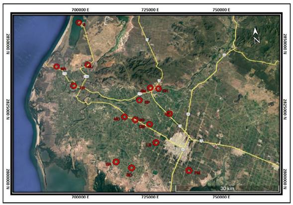 El trabajo de investigación se realizó en el municipio de Ahome, al norte del estado de Sinaloa, del cual se seleccionaron 15 localidades rurales de alta vulnerabilidad que presentan una población de entre 400 a 1500 habitantes, donde se obtuvieron muestras de agua de tomas domiciliarias y se evaluó la calidad bacteriológica. Las poblaciones rurales muestreadas fueron Bachomobampo #1 (BA), Bachomobampo # 2 (BC), Flores Magón (FM), Jitzmuri (JI), Guacaporito (GU), Matacahui (MA), El Refugio (EF), Leyva Solano (LS), San Miguel (SM), Choacahui (CH), El Porvenir (EP), Macapul (MC), Bagojo (BG), 18 de marzo (DM) y Las Brisas (LB) (Figura 1).