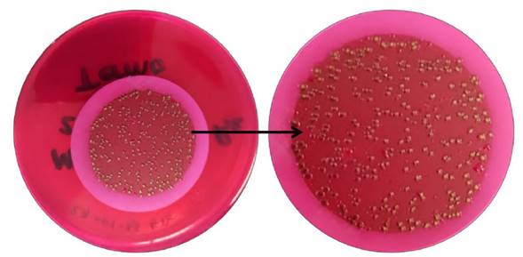 Figura 3 Identificación y cuantificación de las colonias bacterianas de color rojo oscuro con brillo verde metálico, pertenecientes a coliformes fecales termotolerantes.
