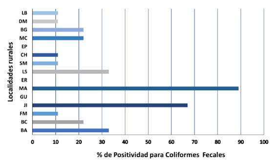 El 80 % de las poblaciones rurales muestreadas y analizadas presentaron resultados positivos para la detección y conteo de coliformes fecales termotolerantes, es decir en 12 de 15 comunidades ejidales, y solo en los poblados de Guacaporito, el Refugio, y el Porvenir se presentaron resultados negativos para la detección de estos microorganismos, lo que se atribuible a que la cloración del agua es más efectiva en estas localidades ya que fue mayor a 1.0 mg L-1. El porcentaje promedio de muestras con resultados positivos para microorganismos termotolerantes variaron de 0 a 89 %, dentro de cada localidad (Figura 4). De las 135 muestras totales analizadas, 104 presentaron un resultado negativo para coliforme fecales termotolerantes y las 31 restantes fueron positivas. Del total de muestras que dieron un resultado positivo, en 24 muestras se pudieron contabilizar entre 1 y 100 UFC 100 mL-1, una con 132 UFC 100 mL-1 y seis fueron incontables. De las 31 muestras positivas a coliformes fecales termotolerantes, 17 no presentaron resultados positivos a la detección para cloro libre residual y en las 14 restantes el cloro libre residual se cuantificó entre 0.1 y 2.0 mg L-1. En las 104 muestras en las que no se identificaron coliformes fecales, se pudo cuantificar el cloro libre residual en 72 de éstas, con valores que oscilaron entre 0.3 y 2.0 mgL-1, en tanto en los 32 restantes no fue detectable.