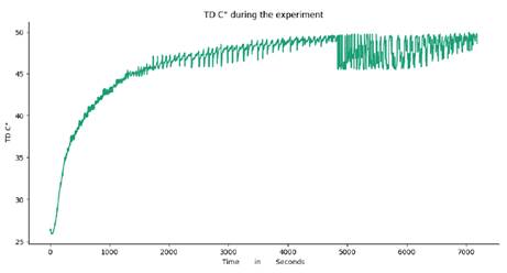 Behavior of Variables: Measurements of the variables were recorded every second. The collected data captures the temporal evolution of temperature, airflow at the oven’s outlet, and the relative humidity percentage of the product (Figures 10 -11). "TD" (Target Dryer Temperature) refers to the target temperature maintained within the dryer chamber throughout the dehydration process, measured in degrees Celsius (°C) (Figure 12).