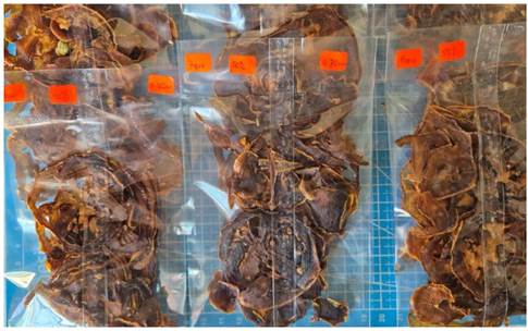 Tomato dehydration organoleptic results: The visual outcomes of the tomato dehydration process are illustrated in Figures 8, where distinct differences in color among the three samples are evident. The images on the left correspond to samples dehydrated at lower temperatures. As reported in relevant literature, color is closely linked to the concentration of lycopene and other essential nutrients.