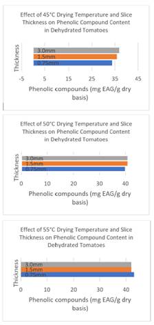 Quantification of Phenolic Compounds: To evaluate the effect of dehydration temperature and slice thickness on nutrient content, a quantification of phenolic compounds was conducted. Phenolic compounds in tomatoes encompass various phytochemicals, including flavonoids, phenolic acids, and tannins, which are vital for plant physiology and defense, as well as for human health due to their antioxidant and anti-inflammatory properties. The concentration of phenolic compounds was quantified in terms of gallic acid equivalents (mg GAE/g dry basis) using a gallic acid calibration curve. Tests were outsourced to a certified private laboratory for accuracy. Following the experimental setup described in Section 2, a total of 3 kg of tomatoes were prepared for dehydration. Each kilogram was dehydrated at different temperatures and subdivided into three groups based on slice thickness (0.75 mm, 1.5 mm, and 3 mm), as shown in Table 1.