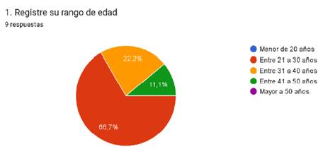 Como se puede apreciar en la figura 1 , una educadora se encuentra en el rango de entre 41 a 50 años, dos en el rubro de entre 31 a 40 años y 6 en el rango de entre 21 a 30 años. Por lo que se percibe que la mayoría de las educadoras comunitarias conforma una población joven.
