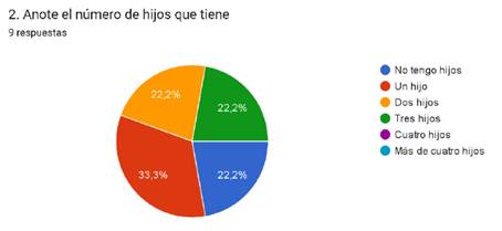 Como se aprecia en la figura 2, las educadoras participantes en el estudio presentan variedad de respuestas ante el indicador número de hijos. Dos de ellas, afirman no tener hijos, tres aseguran tener solo un hijo (con el porcentaje más alto en rojo), con 2 y 3 hijos con porcentajes de 22.2% dos de ellas.