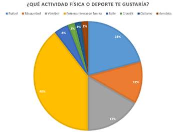 En el ámbito educativo, las instituciones desempeñan un papel crucial en la formación de hábitos saludables. Según Sallis et al. (2012), las universidades que incorporan programas de actividad física personalizados y diversos logran tasas más altas de participación estudiantil y una percepción positiva del entorno académico. Este hallazgo es de interés para el Centro Educativo Jalisco A.C., donde los alumnos expresan interés en la incorporación de disciplinas deportivas adicionales, como se muestra en la Figura 9.