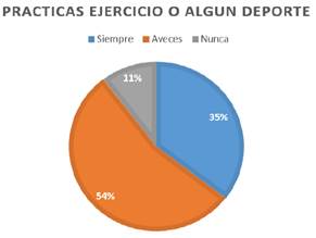 Se observó que 35% de los alumnos manifiestan practicar algún tipo de deporte o ejercicio, es decir que realizan alguna actividad con los elementos de tiempo y frecuencia, lo cual puede impactar significativamente los procesos de salud, seguidos por un 54% quienes manifiestan que algunas veces lo practican, esto nos da pauta a decir que un porcentaje mayor a la población estudiada posee buenos hábitos de actividad física, que relacionándolo al estudio realizado por López et al. (2024), publicado en la revista Mileees, en la misma institución donde se evaluaron los hábitos y conductas alimentarias, se encontró que los alumnos presentan un rango de peso entre 45 y 70 kg. Dichos valores son considerados adecuados según los parámetros de peso para la talla y peso para la edad establecidos por Frisancho (2008). Esto sugiere que existe un equilibrio entre su alimentación y nivel de actividad física.
