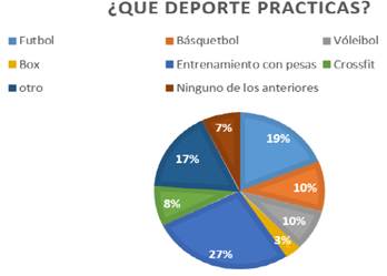 Mediante un cuestionario aplicado a los estudiantes para conocer sus preferencias deportivas, utilizando una escala tipo Likert, se registraron las respuestas mediante la Figura 4, preferencias deportivas primeramente con un 27% al entrenamiento con pesas, seguido con un 19% el fútbol y colocando al Boxeo como la opción menos destacada en términos de votación.