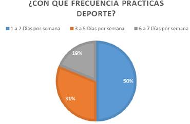 Como se puede observar en la Figura 5, cuando se preguntó a los estudiantes con qué frecuencia practican un determinado deporte, el 19% de los estudiantes afirmó que lo practican todos los días, seguido por un 31% que lo realiza de 3 a 5 días por semana y por último pero no menos importante el 50% de ellos realiza deporte de 1 a 2 días por semana, estos resultados sin duda son relevantes ya que el hábito continuo de ejercicio físico, además de los beneficios corporales ya conocidos que conlleva, que se traducen en un estado de salud excepcional, también se relaciona con la estimulación de la mentalidad, el aprendizaje, la concentración y el desempeño escolar de los alumnos.