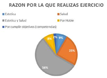 En Figura 6, donde se cuestiona a los alumnos acerca de la razón por la cual realizan ejercicio, se puede observar que, un 75% lo realiza por salud, mientras que 65% por estética; esto nos da indicadores importantes, que como ya se mencionó en el cuerpo del texto, forman parte de los hábito que repercuten positivamente en nuestro bienestar físico, mental y social, al generarse en el cuerpo un aumento del bombeo de sangre por parte del corazón, aumento de la capacidad pulmonar, disminución de la presión arterial, reducción del riesgo de ataques de enfermedades coronarias y más.