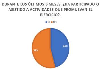 En el gráfico anterior se puede apreciar que el 54% de los estudiantes encuestados no han participado en ninguna actividad externa relacionada con el fomento del ejercicio durante los últimos seis meses. Esto sugiere que la frecuencia de ejercicio mencionada en la Figura 5 se realiza principalmente en espacios específicamente destinados para la práctica de actividades físicas. Sin embargo, la mayoría de la población encuestada no realiza estas actividades en contextos que les permitan medir su desempeño en escenarios competitivos, lo cual sugiere una orientación más hacia objetivos estéticos que hacia metas de competencia o rendimiento. Este hallazgo coincide con investigaciones que señalan que muchas personas, especialmente jóvenes, practican actividad física con fines estéticos, como mejorar la apariencia corporal o ajustarse a ideales socioculturales de belleza más que por razones de salud o competencia (Rodríguez et al., 2020).