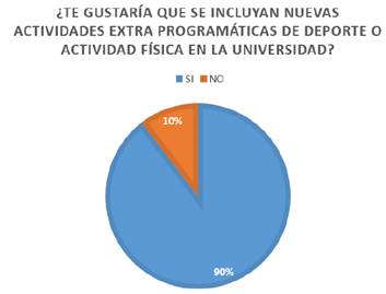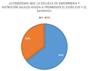 El 65% de los alumnos de la Licenciatura en Nutrición opina que la Escuela de Enfermería y Nutrición Jalisco tiene actividades que fomenten el ejercicio y el deporte, lo cual puede mejorar el ambiente universitario, ya que tienen un impacto positivo en la autoestima, los modelos cognitivos de autopercepción, las estrategias de afrontamiento y la capacidad de los alumnos para establecer redes sociales estables.