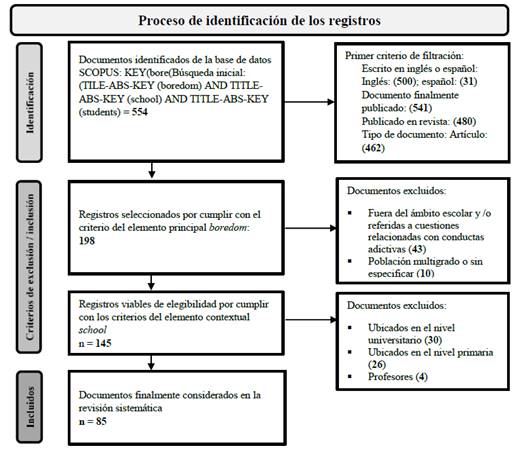 La búsqueda se realizó a partir de los términos: boredom, como concepto principal, school, como elemento contextual y students, como elemento articulador, arrojando un total de 554 documentos. Se aplicaron diferentes niveles de filtración: el primero dejó 462, discriminando artículos en prensa y documentos cuyo idioma no contabilizara más de diez investigaciones; el segundo 198, descartando aquellos que relacionaban el aburrimiento en estudiantes con conductas adictivas u otros problemas no académicos e investigaciones que abarcaban varios grados escolares o no especificaban la población meta; el tercero dejó 145 ubicados en el ámbito escolar, pero como se buscaba la cohorte adolescente se descartaron 60; el cuarto y último cribado dejó 85 artículos elegibles para la revisión, los cuales se depuraron en Excel. En este proceso, la iteración en los filtros por parte de las personas autoras, garantizó la delimitación de los artículos ad hoc (Fig. 1).