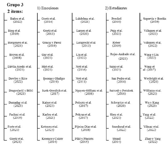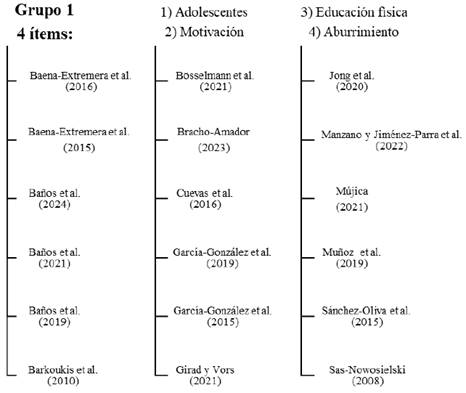 Para dar respuesta a la pregunta ¿cómo se caracteriza el problema del aburrimiento académico en adolescentes en la producción científica? Se identificaron tres ejes temáticos en las investigaciones conformando tres grupos (Fig. 8) que, se describen en la Tabla 2.