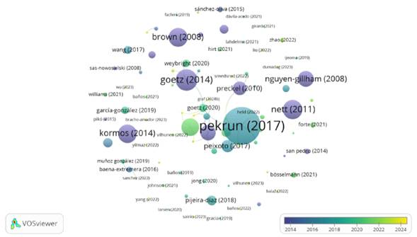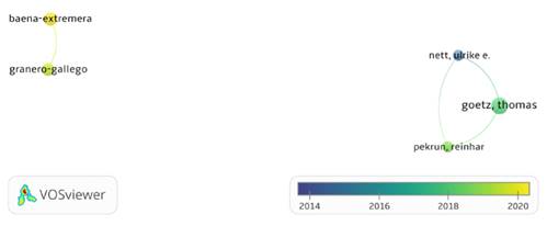 La figura 5 refleja las dos principales redes de coautoría en el tiempo, siendo Ulrike Nett y Thomas Goetz los primeros en trabajar en conjunto, incorporando después a Reinhard Pekrun en la red más antigua. La red más nueva la articulan Antonio Granero-Gallegos y Antonio Baena-Extremera. Los idiomas de los trabajos estudiados están publicados en dos idiomas: inglés 90% y español 10%.