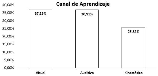 En la Figura 2 se muestra que, en el análisis realizado con los estudiantes de la Licenciatura en Enfermería del Centro Educativo Jalisco A. C., el 37.26 % de los participantes se inclina hacia el canal visual como principal medio de aprendizaje, seguido por un 36.91 % que prefiere el canal auditivo, mientras que un porcentaje menor se orienta hacia el canal kinestésico.