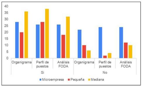 El 24.6% son pequeñas empresas, de estas, el 33 por ciento no cuenta con organigramas, el 7% no tiene perfiles de puestos y el 40% no realiza análisis FODA. En el caso de las medianas, el 14 por ciento no cuenta con organigramas, el 10 por ciento no tiene perfiles de puestos y el 24 no realiza análisis FODA (ver Figura 2).