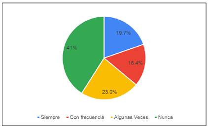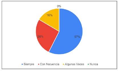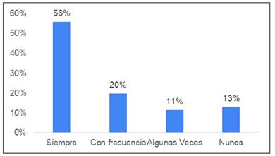 La Figura 3 muestra que el 42% de las empresas no siempre tienen claros sus objetivos a corto y mediano plazo, este dato es preocupante porque revela que no se plantean las medidas que pueden implementar para lograr la sostenibilidad. Su visión está únicamente en generar los mayores ingresos posibles sin una planeación.