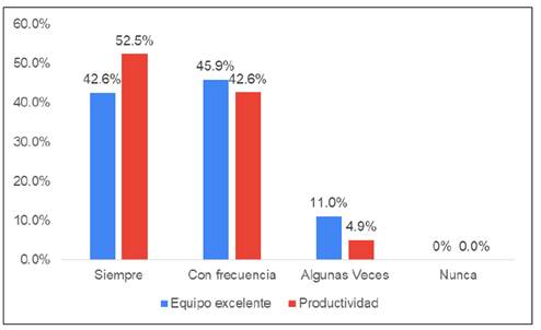 Cabe destacar que el 42.5% de las empresas considera que tienen un equipo de trabajo excelente, que se identifica con la empresa y es leal, esto es bueno porque si se les plantea claramente la misión, visión y los objetivos que persigue la empresa, tienen la disposición de trabajar en esa dirección y cumplir oportunamente con sus funciones. Los empleados son más productivos de lo que valoran los patrones, pues el 52.5% siempre está enfocado en la productividad. Este dato revela que existe la necesidad de revalorar lo que hacen los trabajadores (ver Figura 5), si a ellos también se les otorgan recompensas por su labor, estarán completamente convencidos de la importancia de trabajar en búsqueda de la sostenibilidad empresarial.