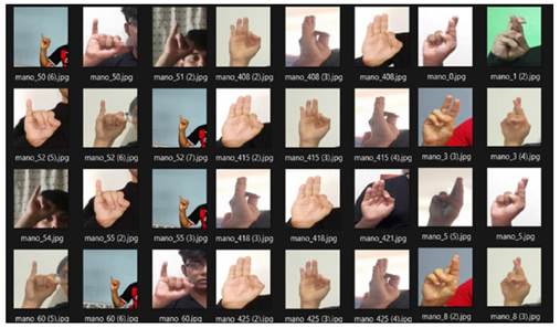 Datos recopilados:Salgado et al. (2024) considera que 21 señas fijas de gestos corresponden al alfabeto dactilológico; 16 expresiones de uso común para señas en movimiento en la comunicación de la LSM; respecto al número de voluntarios, 8 son losparticipantes para las señas fijas y 10 para las señas en movimiento; además se incluye un formato de captura de secuencias de video e imágenes extraídas de cada seña. En la figura 1, se muestran ejemplos de las imágenes obtenidas.