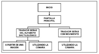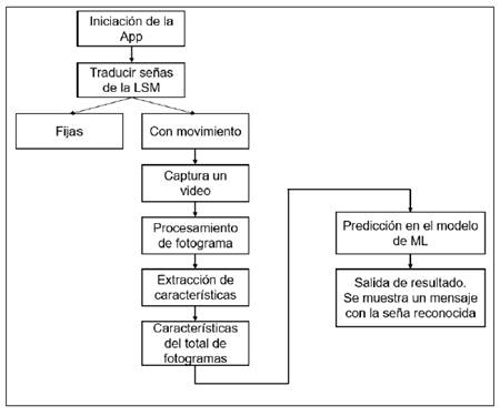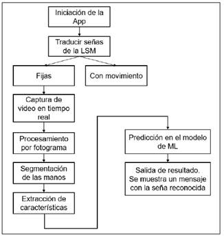 Respecto al desarrollo de la aplicación móvil se trabajó mediante Android Studio y el uso de TensorFlow Lite para la implementación de modelos de aprendizaje automático optimizados. La aplicación permite el reconocimiento en tiempo real de señas fijas y en movimiento mediante la cámara del dispositivo. En la figura 2 se presenta el esquema general.