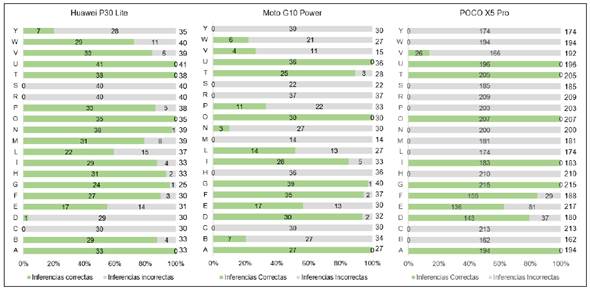 El sistema de reconocimiento de señas basado en Deep Learning fue evaluado en distintos entornos educativos para determinar su precisión y viabilidad. Se realizaron pruebas en aulas con diferentes condiciones de iluminación y otros dispositivos móviles con el objetivo de analizar la estabilidad del modelo. En la figura 6, se muestra la comparación de la cantidad de inferencias correctas e incorrectas en cada smartphone a una distancia de 100 cm entre el dispositivo y la persona señante.