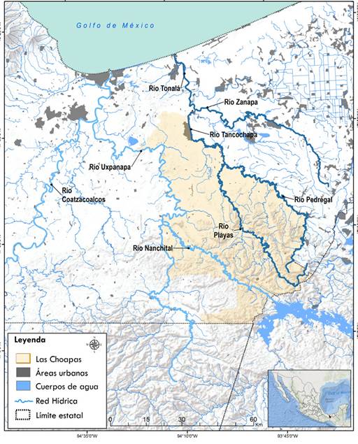 Fuente: INEGI, Red Hidrográfica Escala 1:50000 Edición 2.0. Región Hidrográfica Coatzacoalcos, RH29Ba- R. Coatzacoalcos, INEGI-CONAGUA, 2007. Mapa de la Red Hidrográfica Digital de México. Catálogo de Metadatos Geográficos CONABIO recuperados en noviembre 2018. Mapa elaborado por Geog. César Octavio Sánchez Garay.