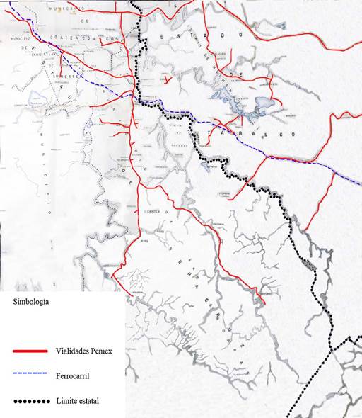 En forma especial debe considerarse la enorme influencia que desde fines del siglo XIX ha tenido la explotación de los ricos mantos petroleros nacionales […] Las compañías petroleras anteriormente y después Pemex, han cooperado sobre todo en Veracruz y sur de Tamaulipas en la construcción de caminos regionales: como ejemplos están las zonas de Tuxpan-Tampico y de Minatitlán-Las Chiapas [Choapas] (Bassols, 1959: 24).