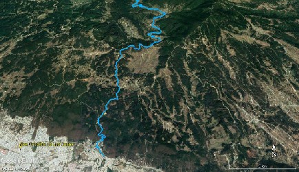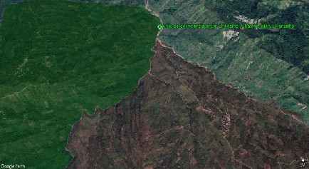 En esta imagen satelital (Imagen II) cada municipio fue resaltado con colores diferentes. A la izquierda, en color verde oscuro, se encuentra el municipio de Chalchihuitán; abajo y al centro, en color rojizo, el de Chenalhó y arriba a la derecha el de Pantelhó. Se marca también el punto de colindancia entre los tres municipios sobre el río Mashiló, A partir de allí, el río se bifurca. Hacia el sureste, marcando el límite entre Chenalhó y Pantelhó. Y hacia el suroeste, señalando el límite entre Chenalhó y Chalchihuitán. Estos “límites naturales” son los que figuran también en los mapas oficiales de la región. Sin embargo, si consideramos la resolución presidencial del año 1975, en lugar de seguir el curso del río habría que trazar un límite “artificial”, que podemos imaginar desde el punto de colindancia señalado en línea recta hacia el sur, lo cual implicaría reconocer una mayor cantidad de hectáreas como pertenecientes a Chalchihuitán.