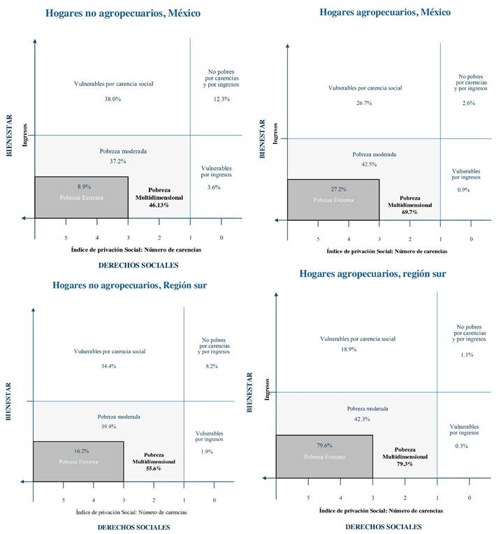 También se analizaron los distintos tipos de hogares siguiendo el enfoque multidimensional para la medición de la pobreza, normado por la Ley General de Desarrollo Social y desarrollado por el Consejo Nacional de Evaluación de la Política de Desarrollo Social (CONEVAL), el cual considera que una persona se encuentra en situación de pobreza cuando tiene, al menos, una carencia social -en alguno de los seis indicadores considerados: rezago educativo; acceso a servicios de salud; acceso a la seguridad social; calidad y espacios de la vivienda; servicios básicos en la vivienda; y acceso a la alimentación- y su ingreso es insuficiente para adquirir los bienes y servicios que requiere para satisfacer sus necesidades alimentarias y no alimentarias.